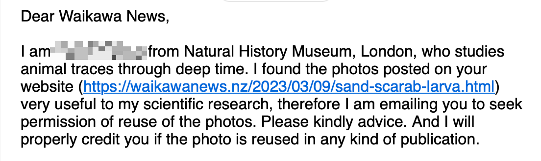 I am [redacted] from Natural History Museum, London, who studies animal traces through deep time. I found the photos posted on your website (https://waikawanews.nz/2023/03/09/sand-scarab-larva.html) very useful to my scientific research, therefore I am emailing you to seek permission of reuse of the photos. Please kindly advice. And I will properly credit you if the photo is reused in any kind of publication.